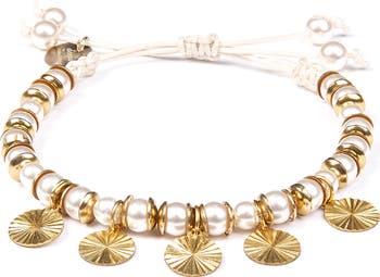 Gilded discs bring glinting movement to this playful beaded bracelet that adjusts for a perfect fit with a slide closure.