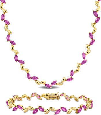 A matching set of a bracelet and necklace covered in lab-created pink sapphires is a perfect way to add luxurious shine to special-occasion looks.