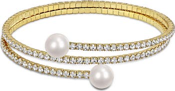 Bring sparkle and lustrous shine to your ensemble with this bypass bracelet inset with round cubic zirconia stones and finished with cultured freshwater pearls.