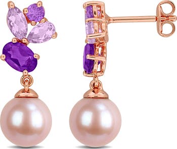 A cluster of amethysts suspends a lustrous pink freshwater pearl in these drop earrings crafted from romantic rose-gold-plated sterling silver.