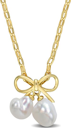 Elegant pearls charm a delicate bow pendant on a gleaming 14k-gold plated chain necklace, bringing a festive finish to your neckline.