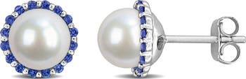 Bring an air of elegance to your lobes with these dainty sterling silver studs centered by cultured pearls detailed with a vibrant halo of blue sapphire.
