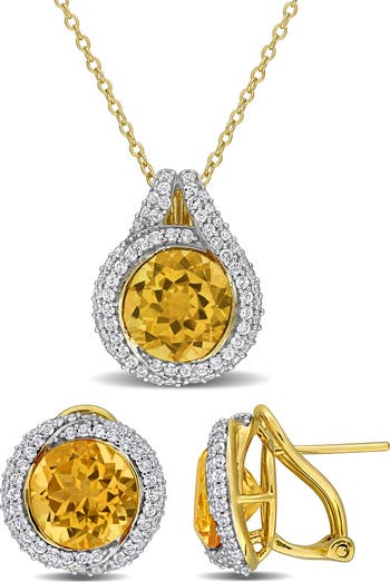 A matching set of stud earrings and a pendant necklace are detailed with citrine and bright-white halos of topaz to take special-occasion looks to the next level.