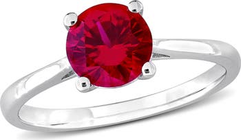 A brilliant created ruby adorns this slim band rendered from polished sterling silver.