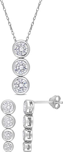 Round-cut cubic zirconia lend elegant sparkle and shine to a matching earrings and necklace set held in a polished sterling silver setting.