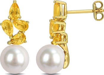 Glossy cultured freshwater pearls and vibrant citrine add a modern flourish to these gold-plated sterling silver earrings.