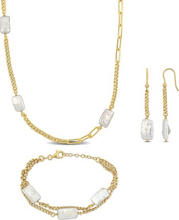A matching earrings, bracelet and necklace set held in a 14-karat gold-plated setting is detailed with illuminating cultured pearls that lend graceful elegance to special-occasion looks.