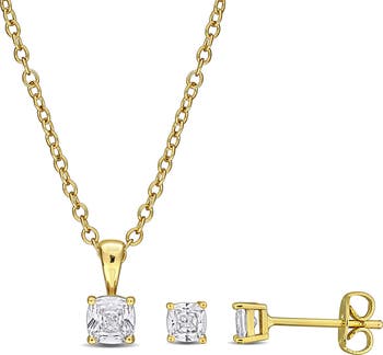 Add sophisticated glamour to special-occasion looks with this earrings and necklace set held in a 14-karat gold-plated setting and detailed with cushion-cut cubic zirconia.