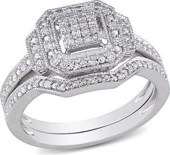 Mark a special milestone with this engagement and wedding band ring set cast from sterling silver with a bead textured band and round-cut diamonds for a brilliant sparkle.