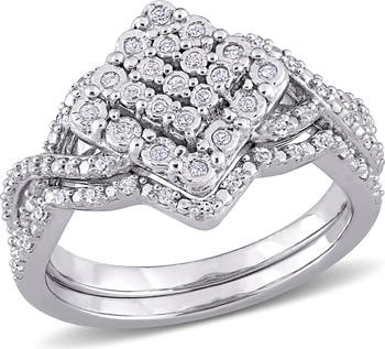 Mark a special milestone with this vintage-inspired engagement and wedding band ring set cast from sterling silver with a bead textured band and round-cut, bezel-set diamonds for a brilliant sparkle.