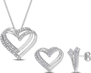 Sweeten your jewelry collection with this set of heart-shaped stud earrings complete with a matching pendant necklace encrusted with white diamonds.