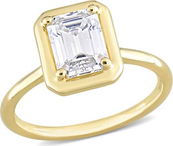 An emerald-cut lab-created moissanite centers a polished ring crafted from 10-karat gold.