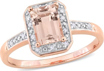 A sparkly diamond halo frames an emerald-cut morganite on this romantic ring crafted from sterling silver and plated in warm rose gold.