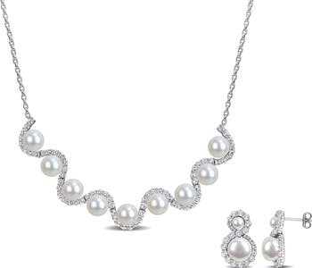 Brilliant white topaz swirl between a stream of lustrous freshwater pearls in this necklace and stud earrings set.