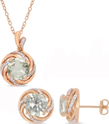 Sparkly round green quartz and pavé diamonds illuminate this swirling stud earrings and pendant necklace set boasting a high-shine finish.