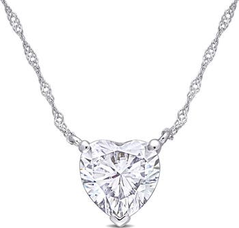 A heart-shaped lab-created moissanite pendant is suspended from a dainty chain necklace crafted from 10-karat gold.