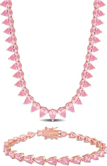 Pear‑cut lab‑created pink sapphires are stationed around this matching tennis necklace and bracelet made from romantic rose goldtone-plated sterling silver.