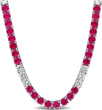 Alternating lab-created ruby and lab-created white sapphire stones deliver a brilliant sparkle to timelessly chic tennis necklace in a sterling-silver setting.