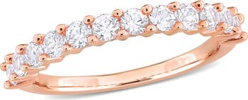 Round-cut lab-created white sapphires encrust the top of this slender band ring crafted from romantic rose-gold-plated sterling silver.