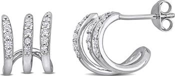 A triple row of lab-created white sapphire define these huggie-hoop earrings that are shaped from sterling silver.