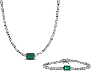 A glamorous tennis necklace and bracelet set made from lab-created white sapphires gets a gorgeous touch of glow thanks to lab-created emerald baguettes.