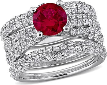 A prong-set lab-created ruby and pavé lab-created white sapphire stones detail a trio of rings in a sterling-silver setting.