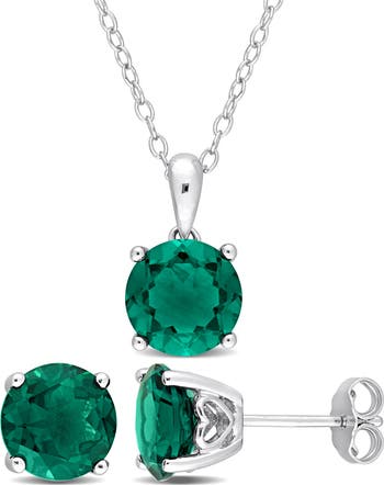 Lab-grown emeralds lend deep color to a matching earrings and necklace set held in a polished sterling silver setting to illuminate your special-occasion looks.