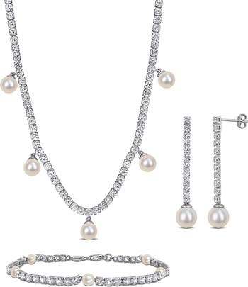 A matching earrings, bracelet and necklace set held in a sterling silver setting is detailed with shimmering lab-grown sapphire and illuminating cultured pearls that lend sophisticated glamour and elegant sparkle to special-occasion looks.