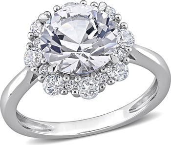 A perfect halo amplifies the elegant shine that exudes from a polished sterling silver ring centered by a brilliant round-cut lab-grown white sapphire.