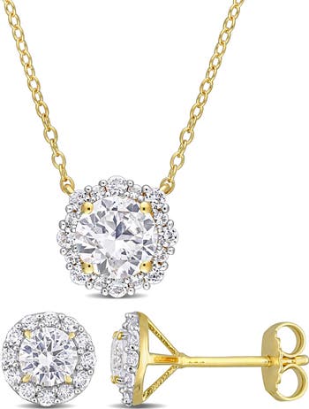 Show off glamorous sparkle with this lab-grown white sapphire halo stud earrings and pendant necklace set.