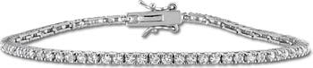 Prong-set round lab-grown white sapphires bring luxurious sparkle to this elegant tennis bracelet crafted from polished sterling silver.