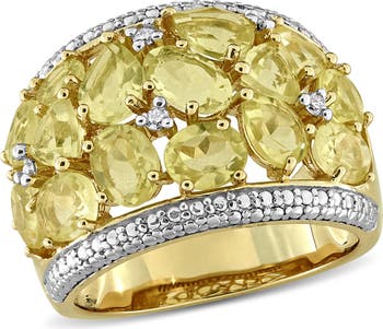 An assortment of mixed-cut lemon quartz stones and dainty diamond create a brilliant mosaic over a wide-band statement ring.