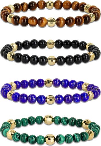 Refresh your man's jewelry collection with this assortment of stretch bracelets strung with 14-karat gold-plated spacers and semiprecious stone beads that make a vibrant stack.