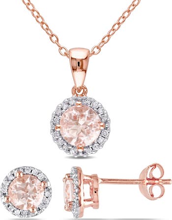 Show off elegant sparkle with this rosy necklace and earrings set illuminated by round-cut morganites framed by dainty diamond halos.