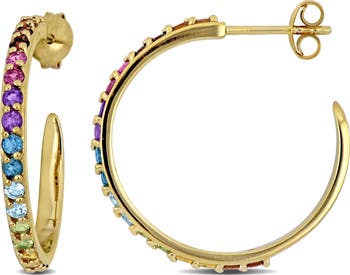 Round-cut semiprecious stones combine to make a stunning rainbow array on polished hoop earrings finished in high-shine polish.