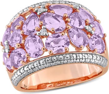 A striking two-tone finish defines the wide dome silhouette of a polished ring topped with Rose-de-France amethyst interspersed with brilliant diamonds.