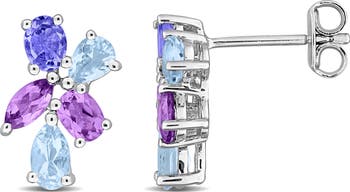 Mixed-cut amethysts, sky blue topaz and tanzanites enrich these dainty clustered stud earrings crafted from polished sterling silver.
