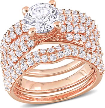 Deliver elegant sparkle to your sophisticated looks with this trio of stacking rings adorned with bright-white lab-grown sapphire and done in rosy, high-shine finish.
