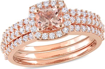 Deliver elegant sparkle to your sophisticated looks with this trio of stacking rings featuring a rosy, high-shine finish along with a singular morganite and bright-white lab-grown sapphire.