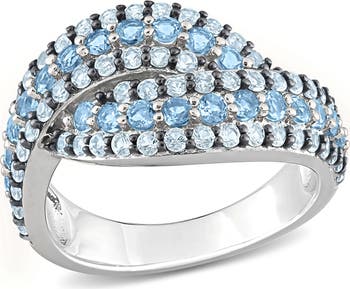 Undulate streams of sky and Swiss blue topaz flow and cross through this sterling silver ring sparkling all the way.