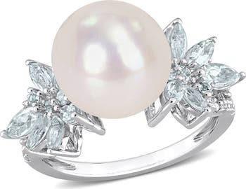 A glossy freshwater pearl floats atop a cluster of marquise-cut diamonds that bring vintage elegance to this sterling silver ring.