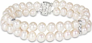A double row of freshwater pearls detail this sterling silver bracelet.