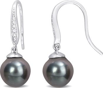 Lustrous black Tahitian cultured pearls accent these sterling silver earrings finished with sparkling diamonds.
