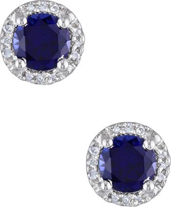 - Sterling silver prong set round cut created blue sapphire with halo stud earrings
