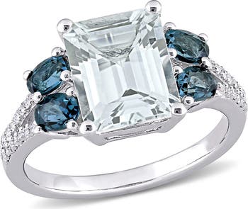 Add the perfect finishing touch to your ensemble with this sterling-silver ring featuring a radiant-cut ice aquamarine encircled by London-blue topaz and diamonds.