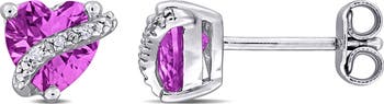 A lovely gift, these sterling silver stud earrings showcase lab-grown pink sapphire hearts hugged by dainty diamonds for romantic sparkle.