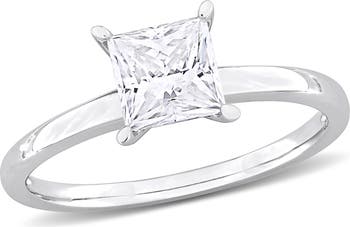 A polished sterling silver ring showcases a prong-set princess-cut moissanite for glamorous sparkle.