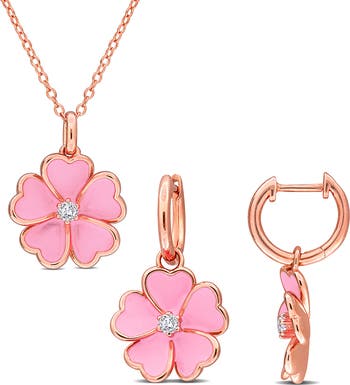 Rosy 14-karat-gold plating adds to the sweetness of a matching necklace and earrings set that suspend flower-shaped drops centered by dainty white topaz and colored with enamel petals.