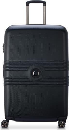 Exterior features: Flexible polycarbonate material with a textured surface ensures lightweight durability and protection. A telescoping handle maximizes comfort and control for users of different heights. Four double-wheel spinners glide effortlessly to navigate through busy airports.