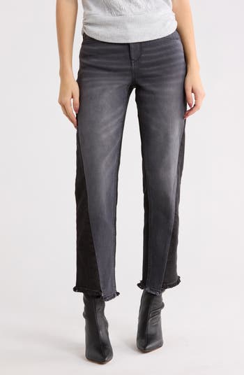 A colorblock design and frayed step hems enhance the timelessly cool vibe of these high-waisted jeans cut from soft stretch denim.